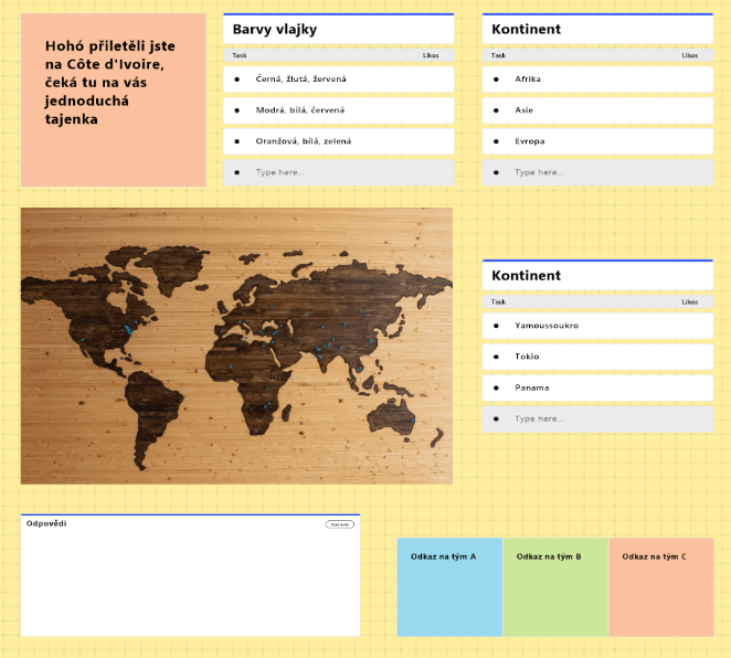 Základem pro vytvoření naší hry je vytvoření týmů. Týmy vytvoříme tak, jak jsme zmínili výše. Důležité pro nás je, jak týmy pojmenujeme a jaké nastavíme jejich obrázky. V našem případě jsme se rozhodli pro názvy jednotlivých států, které v průběhu hry navštívíme. Jako obrázky pak logicky vyplynuly jejich vlajky. Pro naši hru můžeme použít trasu z České republiky na východ, to je přes Indii a Thajsko do Austrálie, Mexika, Côte d’Ivoire a s koncem v Německu. To lze využít například v hodině zeměpisu.