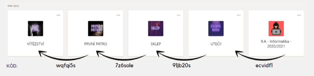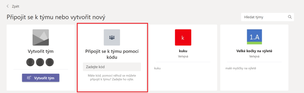 Kliknutím na toto tlačítko se dostanou do nabídky otevřených týmů, ke kterým se mohou připojit, či právě k možnosti Připojit se k týmu pomocí kódu. Tuto možnost využije každý žák ze skupinky. Tím se jim zobrazí další tým, tedy další místnost únikovky.