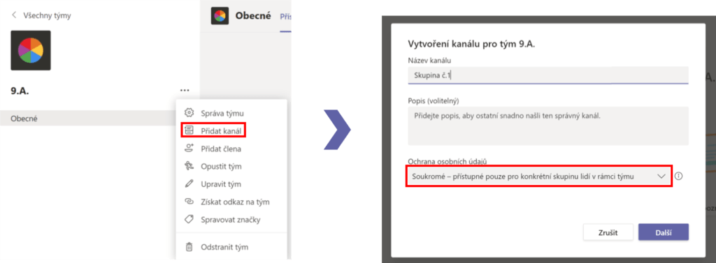 Tento postup opakujeme tak dlouho, dokud nebudeme spokojeni s počtem úrovní neboli místností, kterými musí účastníci projít. Připomínáme, že jedna místnost ve hře se zde rovná jednomu týmu a každá místnost, tedy každý tým, má svůj kód, kterým se do něj hráči dostanou. Herní prostředí máme vytvořené, ale jak do něj dostat žáky? Na to se hned podíváme! Nejprve musíme přejít zpět do našeho výchozího kmenového týmu, kterým může být, jak už bylo zmíněno, tým celé třídy. Zde žáky rozdělíme do soukromých kanálů, ze kterých budou po skupinách vycházet. Klikneme zde na tři tečky vybereme možnost Přidat kanál.