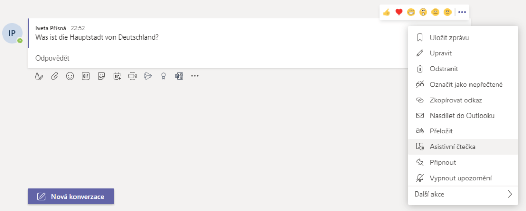 Máme pro vás tip! Pro oživení vaší únikové hry můžete studentům pokládat otázky týkající se dané země v jejím úředním jazyce. Studenti si následně mohou texty z cizího jazyka přeložit pomocí Asistivní čtečky, kterou mají zabudovanou v Microsoft Teams pod třemi tečkami u příspěvku. Díky tomu se hra určená pro zeměpis může rázem změnit v hru určenou třeba pro cizí jazyky.
