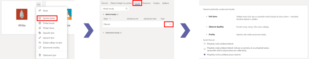 Dále si vytvoříme zcela nové týmy, jejichž názvy jsou čistě na nás a které jsou pouze dočasné. V podstatě si teď vytváříme herní prostředí, přes které budou žáci procházet. Jedná se jak o veškeré postupné místnosti, vezmeme-li v potaz herní terminologii, tak i vítězný tým. Tím může být třeba tým pojmenovaný "východ", "brána ven" a podobně s oznámením, že jsou hráči na konci. Nejdůležitější věc po vytvoření týmu je přejít do Správy kanálu a zde vybrat možnost Příspěvky mohou přidávat pouze vlastníci. Jak se tam dostaneme? Klikneme na tři tečky v levém horním rohu týmu nebo u názvu týmu a zvolíme možnost Správa týmu. Poté nahoře klikneme na Kanály, u názvu kanálu opět klikneme na tři tečky a zvolíme možnost Správa kanálu.
