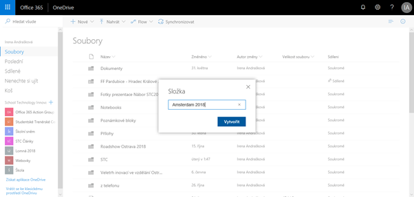 OneDrive umožňuje nahrát své dokumenty na cloudové úložiště, a tak k nim mít přístup ze všech svých zařízení připojených k internetu, jako je například tablet a chytrý telefon. Nejprve přejdeme do našeho vlastního cloudového úložiště na adrese onedrive.com. Pro vytvoření nové složky použijeme možnost Nové – Složka a tu si pojmenujeme.