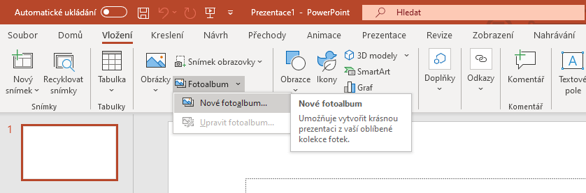 V PowerPointu vytvořme novou prázdnou prezentaci. A nezapomeňte, když ji uložíte na OneDrive, bude dostupná z jakéhokoli zařízení. Na kartě Vložit můžeme ve skupině Obrázky najít tlačítko Fotoalbum. Pokud jste si jej až do dnešního dne nevšimli, věřte, že nejste sami. V nabídce pod ním klikneme na možnost Nové fotoalbum...