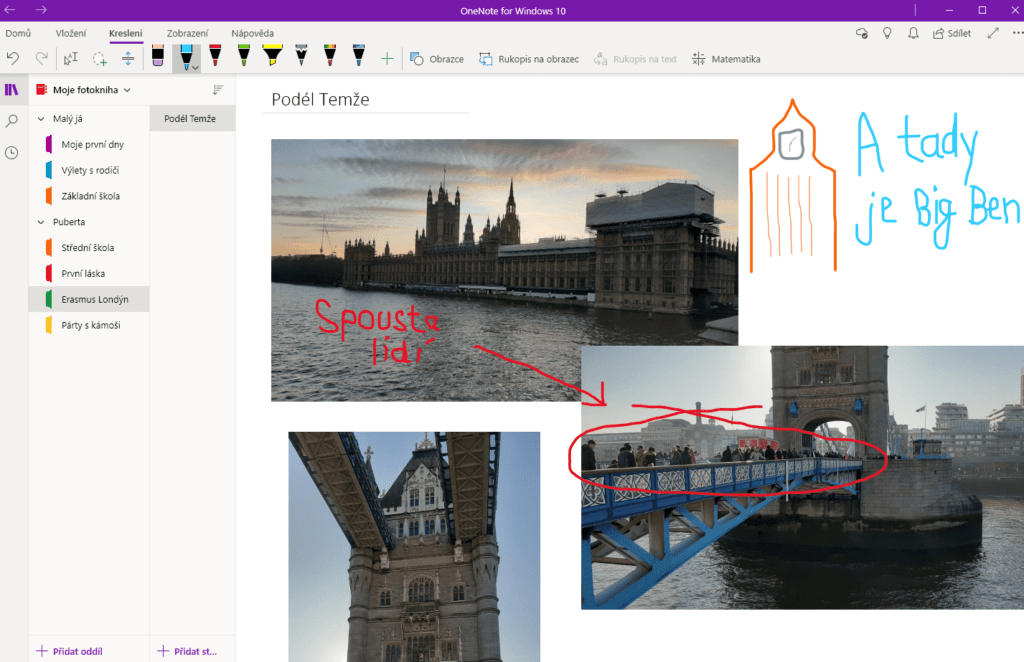 A potom už je to velmi jednoduché, jakoukoli fotku přidáme pomocí karty Vložení a funkce Obrázky. Ihned po vložení jí můžeme upravit velikost nebo ji pouhým přetažením přesunout na jiné místo na stránce. Karta Kreslení pak obsahuje širokou nabídku per, u kterých lze měnit barvu i velikost. Text napsaný na klávesnici může střídat text psaný ručně, to zejména tehdy, máme-li dotykové zařízení se stylusem. Nezbývá než popřát hezčí ilustrace než na našem obrázku.