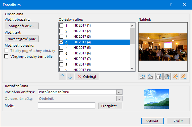 V tuto chvíli po nás PowerPoint bude chtít vybrat všechny fotky z úložiště počítače, které použijeme, což můžeme učinit přes tlačítko Soubor či disk... Může jich být pár, mohou jich být desítky, to už je na vás. Následně nezapomeňme zaškrtnout příslušná políčka u těch fotek, které bude potřeba ještě částečně upravit. Všimněte si, že zdaleka zde nemáme jen možnost odebrání, ale také změny pořadí nebo vpravo i změny jasu, kontrastu a dalších základních parametrů každé fotky.