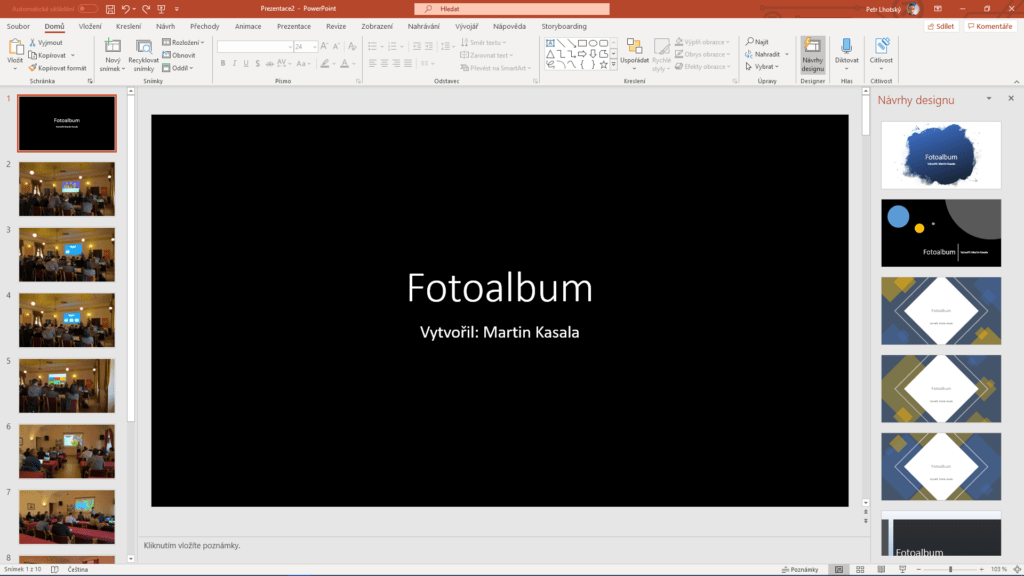 Až budeme spokojeni s výběrem, není nic jednoduššího než kliknout na tlačítko Vytvořit v dolní části okna. V ten okamžik se vytvoří nová prezentace, která obsahuje úvodní snímek a námi zvolené fotky v námi definovaném pořadí. Pokud využíváme nejnovější PowerPoint v rámci balíčku Office 365, umělá inteligence vygeneruje navíc pár návrhů designu, jak by mohl vypadat náš úvodní snímek, a nabídne je ve sloupečku Návrhy designu vpravo.