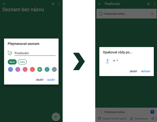 Na plán tréninků si vytvořte nový seznam úkolů. Klikněte proto na tlačítko Nový seznam a pojmenujte si jej. Následně tlačítkem s ikonou plus, pojmenovaným Přidat úkol, vytvoříte váš první úkol. Nazvěte si ho například "Posilování nohou" a nastavte mu opakování, u kterého si můžete vybrat pravidelnost například vždy po třech dnech. Nastavit si pochopitelně můžete i připomenutí, tedy v jaký čas chcete dostávat upozornění na daný úkol.