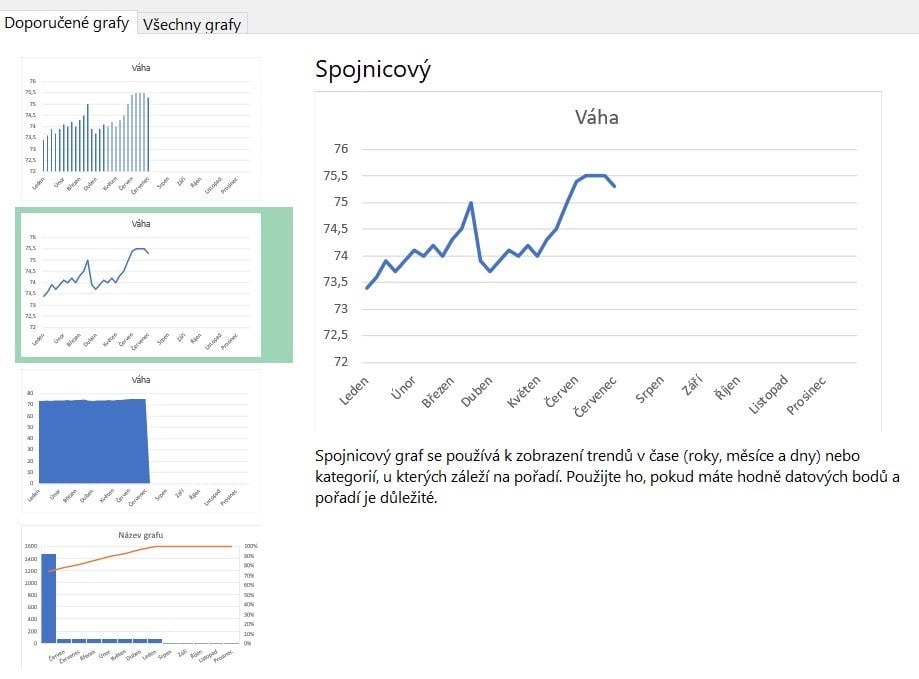 Nyní vyberte oblast dat neboli všechny buňky, které jste doposud vyplnili, což by měl být rozsah buněk A1:C54. Poté na kartě Vložení zvolte Doporučené grafy, záložku Všechny grafy, kategorii Spojnicový a přesný typ Spojnicový, který znázorňuje průběh váhy jako na obrázku. Je možné, že se nabídne už mezi doporučenými grafy. Výběr potvrdíme tlačítkem OK.