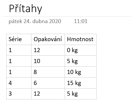 Na obrázku výše si můžete všimnout i tlačítka Tabulka. Právě ta je ideální pro zápis počtu opakování cviků a hmotností. Klikněte na tlačítko a vyberte počet sloupců a počet řádků, až tak je to jednoduché. Pokud máte tabulku označenou, objeví se nám nahoře navíc ještě kontextová karta Tabulka, v níž kromě práce s rozložením naleznete i možnosti stínování nebo ohraničení. Nás ovšem bude spíše zajímat vyplnění údajů do tabulky, proto si pojmenujte sloupečky a přidejte data do řádků například jako my na obrázku níže. Tabulku si však můžete upravit úplně, jak chcete, jediným limitem je vaše představivost.