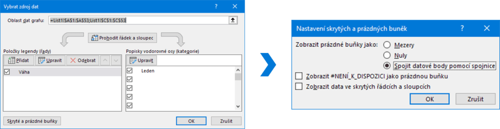 Zobrazený graf není ještě zcela hotový, spojnice nám totiž konstantně nepokračuje až do 52. týdne. Pohodlnější a užitečnější je, pokud se data nově vepsaná do tabulky promítnou i do grafu samotného. To se ale neobejde bez kroku navíc. Klikněte na graf a na nově zobrazené kontextové kartě Návrh grafu klikněte na možnost Vybrat data. Otevře se vám okno pro úpravy zdrojů dat k vaší tabulce. V dolním levém rohu klikněte na tlačítko Skryté a prázdné buňky. To vás přesměruje do nového okna, kde v nabídce Zobrazit prázdné buňky jako vyberete třetí možnost Spojit datové body pomocí spojnice.
