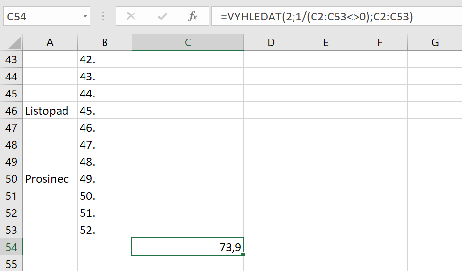 Aby se vám později graf správně zobrazoval, budete muset použít funkci VYHLEDAT. Funkci VYHLEDAT v Excelu používáme zjednodušeně pro vyhledávání a reference. Je schopna nám ve sloupcích či řádcích najít konkrétní hodnotu a zobrazit ji v jiném řádku nebo sloupci. Jak to tedy bude vypadat konkrétně v našem případě? Do poslední buňky (tedy po 52. týdnu) ve sloupci C, což by měla být buňka C54, vložte vzoreček =VYHLEDAT(2;1/(C2:C53<>0);C2:C53), který vám zobrazí poslední zadanou váhu. Oblast C2:C53 odpovídá všem buňkám, jež obsahují nebo později budou obsahovat zadanou hodnotu.