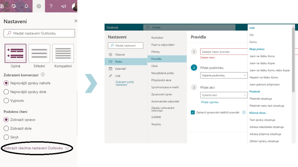 Kdepak! Úklid lze nastavit automaticky. Vpravo nahoře se nachází nastavení. Zde si můžete nastavit základní věci jako například rozložení stránky apod. I když se to nezdá, po dobu studia zde strávíte opravdu spoustu času, takže doporučujeme si alespoň základní věci přizpůsobit. Dole je možnost Zobrazit všechna nastavení Outlooku. Zde si můžete nastavit úplně cokoli, ať už to je řazení pošty, podpis na konci mailu nebo vytvoření nových pravidel. Pravidla nám mohou udělat pořádek v naší schránce. Můžeme si zde nastavit, do jaké složky nám budou zprávy chodit, na základě určité podmínky, například podle toho, kdo e-mail odesílal, jaký má předmět nebo dokonce jaké má přílohy. Jakmile e-mail přijde, roztřídí se, a to znamená jediné, přehlednost.