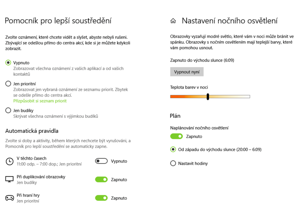 Pracujete často na úkolech dlouho do noci a pálí vás oči? Displej si můžete přizpůsobit do teplejších barev, a to v Centru akcí v pravém spodním rohu, kde také naleznete Pomocníka pro soustředění, s pomocí kterého můžete omezit oznámení, abyste nebyli při práci rušeni a lépe se soustředili na vypracování úkolů. Pokud přejdete do aplikace Nastavení, například z nabídky Start, lze si zde v sekci Systém obě tyto funkce automatizovat, tedy aby se jak Noční osvětlení, tak také Pomocník pro lepší soustředění zapínaly a vypínaly automaticky ve vámi stanovený čas nebo dokonce dle aktuálního západu a východu slunce.