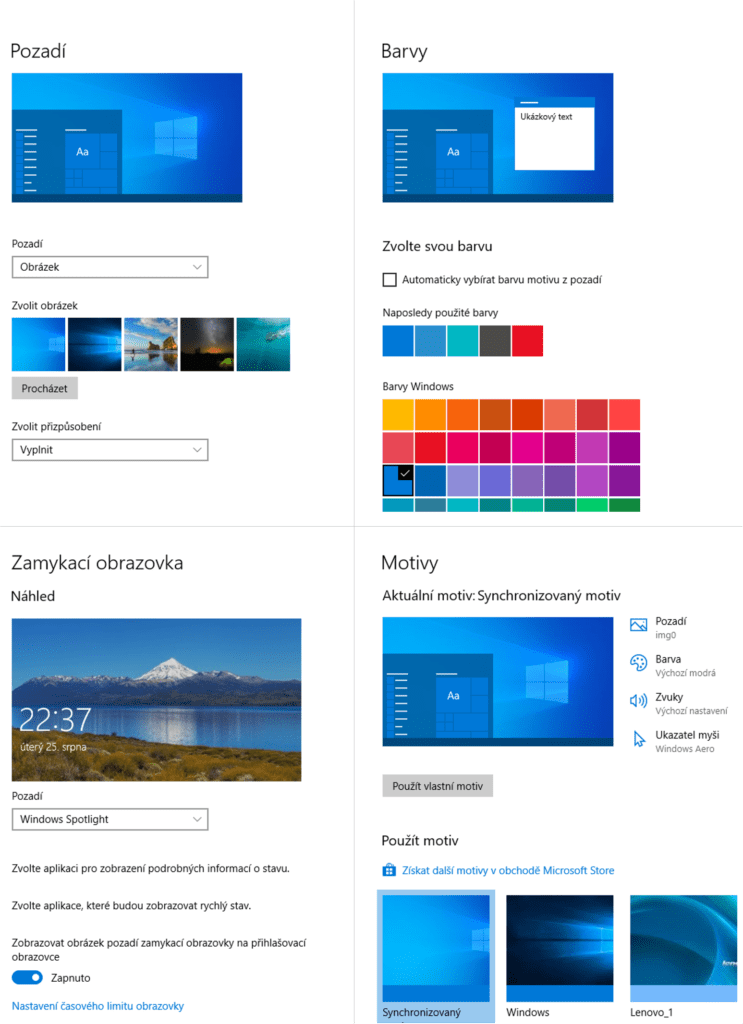 V Nastavení naleznete i samotnou kategorii Přizpůsobení, kde se nachází veškeré upravování pozadí, barev, písma a mnoho dalšího. Když už jsme u toho pozadí, mám tu pro vás novinku. Uživatelé Bingu to již budou znát, ale jde o funkci měnícího se pozadí, které nyní můžete nastavit i na svoji plochu. Je to opravdu velmi jednoduché a pokud vás tato funkce zaujala, více k ní se dozvíte v článku Bing Wallpaper – každý den jiné pozadí plochy. Nastavení pozadí, zvuků, barev a ukazatele lze zabalit do motivu a obměňovat dle nálady. V Microsoft Store naleznete spoustu předpřipravených, z nich si určitě dokáže vybrat každý.