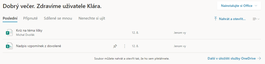 - Vlevo se nachází tlačítko s devíti tečkami, díky kterému se zobrazí nabídka všech aplikací, jež můžete v rámci licence využívat. A pár souborů, na kterých jste pracovali naposledy. Je zde i rychlá možnost nový dokument, sešit, prezentaci, poznámkový blok, průzkum nebo novou stránku Swaye vytvořit. Možností Další dokumenty se lze dostat k OneDrive.