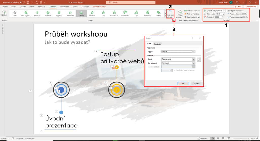 Zde vidíme jednotlivou posloupnost všech animací, od první k poslední v řadě. Každé animaci můžeme ve skupině Časování nastavovat, kdy se má spustit (po kliknutí, s předchozí, po předchozí), dobu trvání nebo třeba zpoždění (číslo 1 na obrázku níže). Ve skupině Animace můžeme také u některých animací (setření, rozdělení,…) měnit možnosti efektu (2). Toto se nám může hodit při animacích v grafech. V nich můžeme měnit, zdali se budou zobrazovat po kategoriích nebo například řadách. Doporučuji si projít i pokročilé možnosti. Do nich se dostaneme šipkou v pravém dolním rohu ve skupině Animace (3).