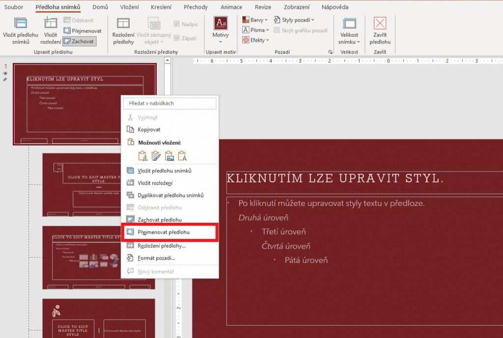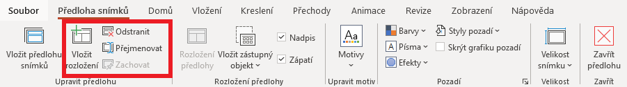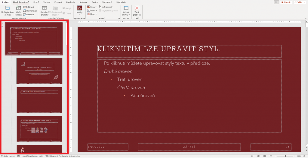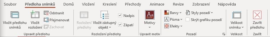 Pro použití vyberte na horní liště Zobrazení a Předloha snímků. Namísto prezentace nyní vidíte veškerá rozložení snímků, která jsou ve vašem návrhu. Cokoliv, co zde uděláte, nezmění obsah vaší prezentace, pouze její vzhled a rozložení. Předloha snímků je větší náhled v podokně miniatur na levé straně okna. Menší náhledy pod ním jsou všechna jednotlivá rozložení snímků. Chcete-li provést změnu pro celou prezentaci, upravte Předlohu snímků. Můžete tak například změnit font nadpisů, přidat své logo, změnit rozložení atd. Úprava rozložení snímku ovlivní pouze snímky v prezentaci, které toto rozložení používají.