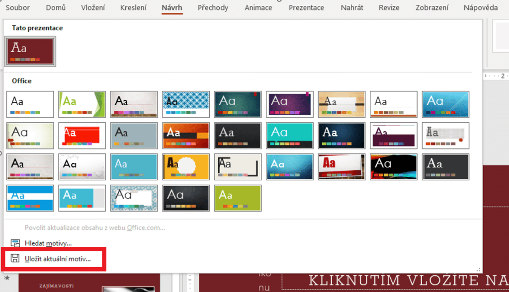 Stejně jako jeden snímek, si můžete uložit i vaši přizpůsobenou Předlohu snímků. Klikněte na náhled Předlohy snímků na levé straně okna, přejmenujte ji a uložte. Zpět v normálním zobrazení na horní liště klikněte na Návrh, poté na vaši pojmenovanou Předlohu snímků na Uložit aktuální motiv. Tímto způsobem budete nyní moci použít svůj vlastní design v budoucích PowerPoint prezentacích.