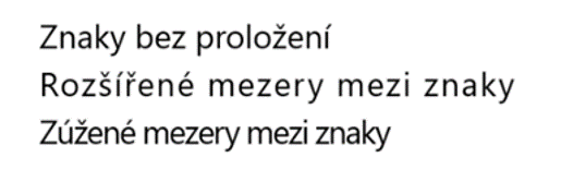Jednotlivé znaky (písmena) není vhodné prokládat mezerami. Čím je větší mezera mezi písmeny, tím je text hůře čitelný, proložení mezerou by se dalo vzít v potaz jedině u nadpisů, jelikož to jsou krátká slova nebo sousloví. I opačná situace není ideální, když jsou mezi znaky zúžené mezery, jednotlivá písmenka pak z dálky mohou začít splývat dohromady (viz Obr. 4).