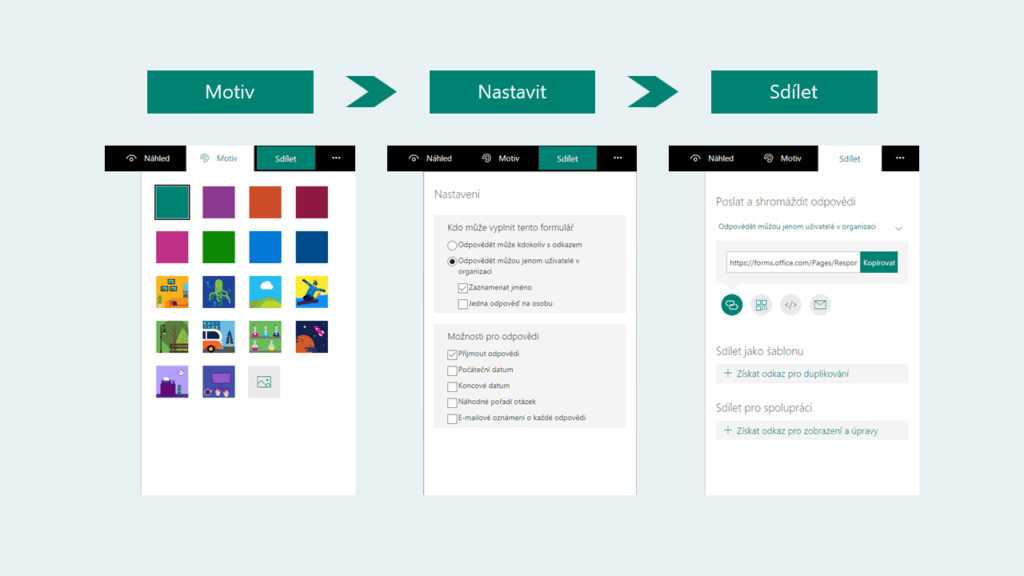 - Další možností je sdílení pro účely spolupráce na formuláři či na kvízu
