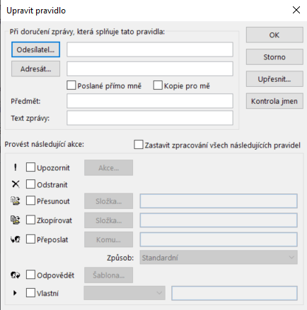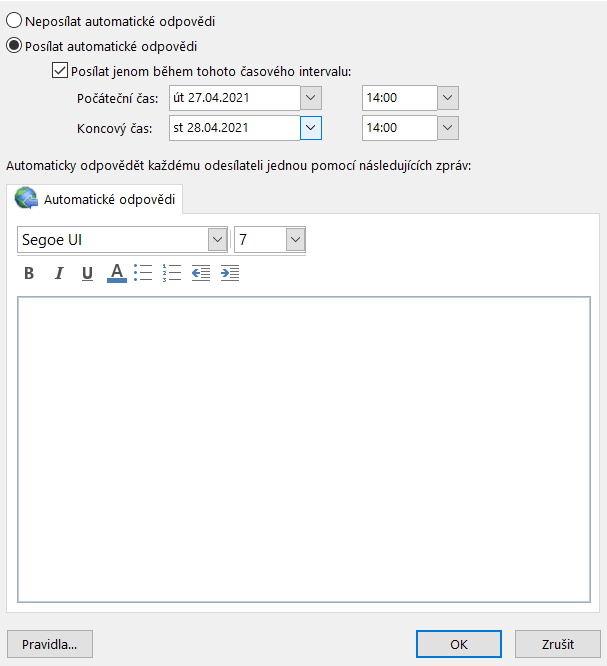 Pokud ovšem nechcete odesílat odpověď každému e-mailu, který dostanete, můžete vlevo dole kliknout na tlačítko Pravidla a nastavit nějaké podmínky, za kterých se odešle automatická odpověď nebo můžete i nastavit, že se e-mail přesune do určité složky apod. Například: pokud má email předmět "Domácí úkol", automaticky se přesune do složky "Škola".