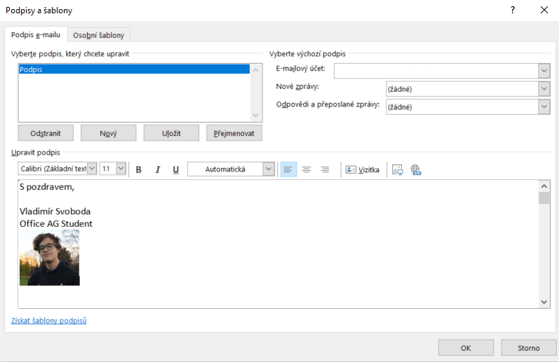 V Outlook je funkce pro automatické přidávání podpisů k vašim e-mailovým zprávám. Váš podpis může obsahovat text, obrázky, elektronickou vizitku, logo nebo dokonce obrázek vašeho vlastnoručního podpisu. Podpis si nastavíte při psaní e-mailu kliknutím na tlačítko Podpis a poté na Podpisy a šablony. Zobrazí se vám okénko, ve kterém už můžete kliknout na tlačítko Nový, pojmenovat si váš podpis a začít ho psát.