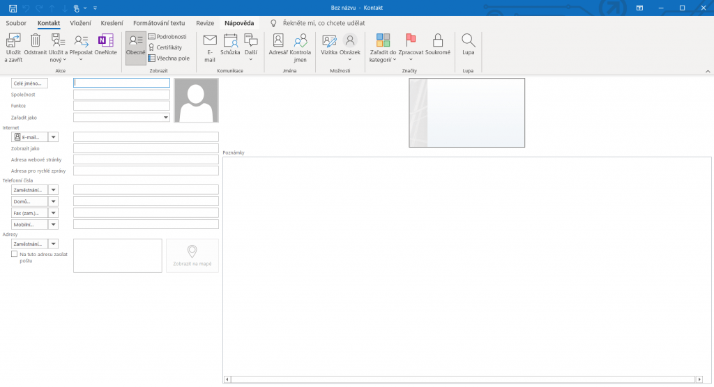 A jako poslední tady máme kontakty. Kontakty se dají využít pokud chcete například poslat e-mail skupině lidí a nechcete neustále vypisovat jejich e-mailové adresy. Kontakty můžete přidávat manuálně kliknutím na tlačítko Nový kontakt a vyplněním informací typu jméno, e-mail, telefonní číslo, ale také si k nim můžete přidat i webové stránky, fotografii nebo adresy.