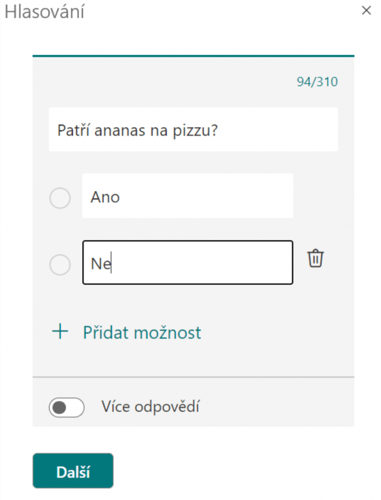 A jako poslední si ukážeme hlasování. Ve vaší e-mailové zprávě můžete jednoduše vytvořit hlasování, ve kterém mohou příjemci zprávy hlasovat přímo v e-mailu nebo si formulář otevřít ve svém prohlížeči. Hlasování vytvoříte při psaní e-mailové zprávy kliknutím na tlačítko Hlasování v kartě Vložení. Do hlasování nejdříve zadáte otázku a poté počet odpovědí, který vám vyhovuje. Můžete také zaškrtnout tlačítko Více odpovědí.