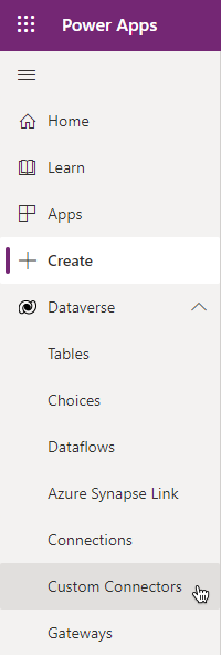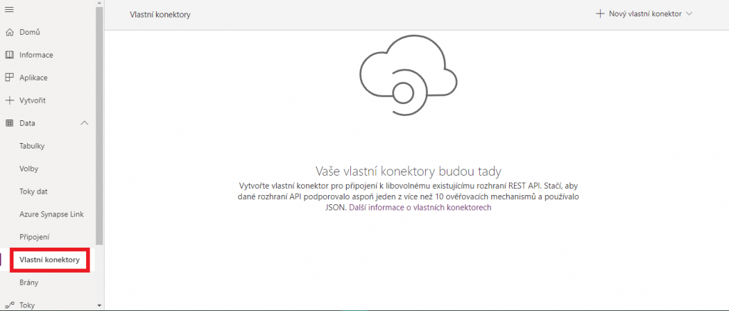 Jakmile se dostaneme na defaultní stránku, můžeme směřovat přes rozbalení ,,Dataverse" (v češtině jen ,,Data") v nabídce vlevo ke ,,Custom connectors" (v češtině ,,Vlastní datové konektory")