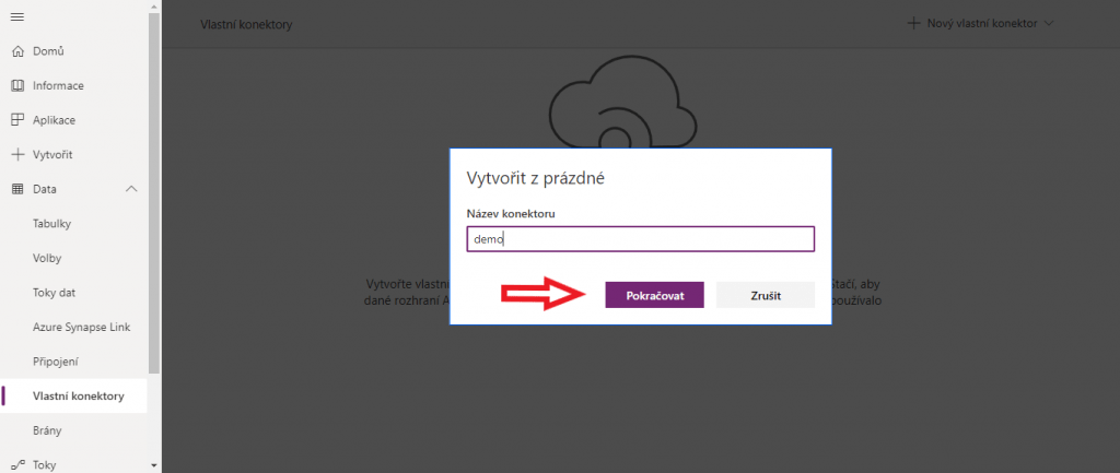 - Konektor pojmenujte a opřete se o tlačítko ,,Pokračovat."