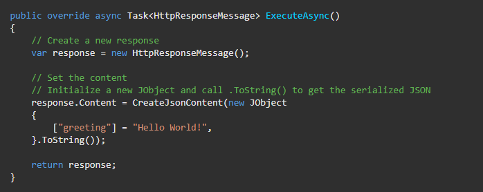 Názorná ukázka použití vlastního kódu. Ukázka vrací spojení Hello World jako odpověď na všechny požadavky.