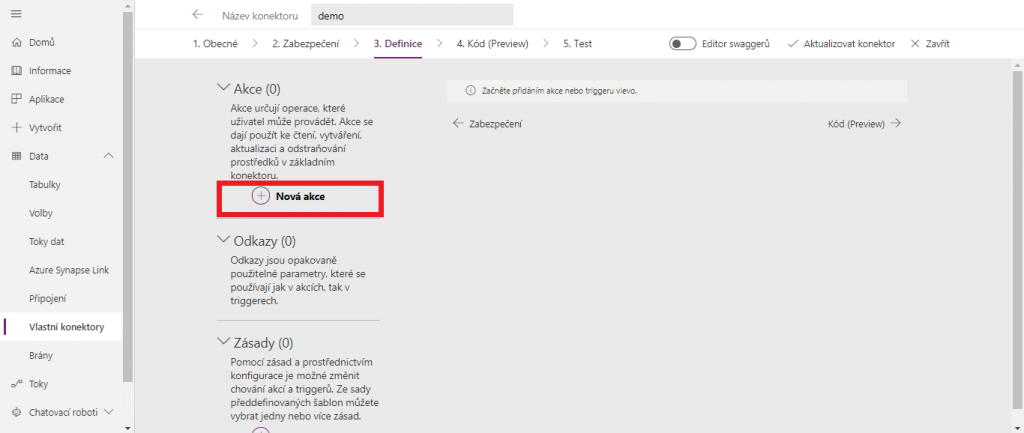Poznámka: Definice OpenAPI je volně stažitelný soubor základních instrukcí pro komunikaci mezi dvěma aplikacemi. Do této definice můžeme poté přidávat vlastní instrukce a podle toho rozšiřovat funkčnost konektoru.