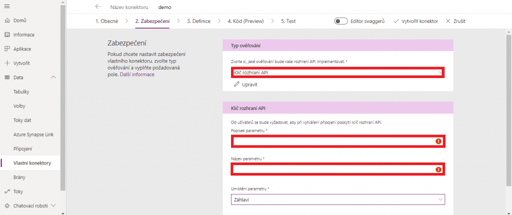 K zabezpečení vlastního konektoru máte na výběr z několika možností. Zvolte Klíč API, který se používá k ověření rozhraní API.