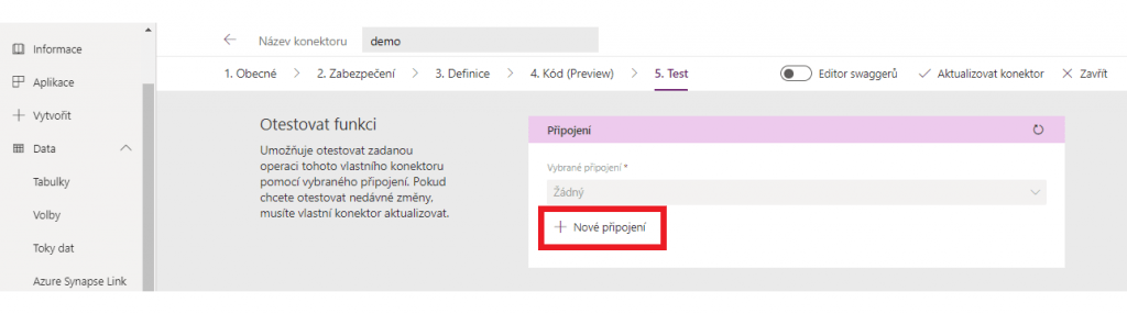 Vyberte si připojení a otestujte operaci vlastního konektoru.