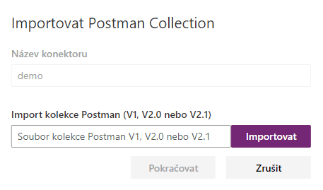 Pak přichází čas si doladit konektor dle svých představ, tudíž ho i libovolně pojmenovat. Ve stejném kroku jednoduše klikneme na políčko ,,Import" a vložíme připravenou vlastní či staženou předlohu definice. Práce tu upadá ve chvíli stisknutí tlačítka ,,Pokračovat."