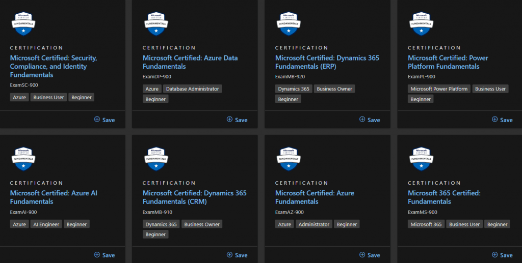 Tato kategorie je zaměřena na klíčové technologie ekosystému Microsoft, zejména Azure, Microsoft 365, Power Platform, Dynamics 365. Poznáte je pomocí typického zápisu jejich zkratky ve formátu zkratka_sluzby-kod_zkousky (př. AZ-900, kde AZ je zkratka pro Azure a 900 je kód dané zkoušky). Kód zkoušky vám může napovědět její obtížnost. V případě kódu 900 se jedná o zkoušku spadající do skupiny Fundamentals, tedy začátečnické úrovně.