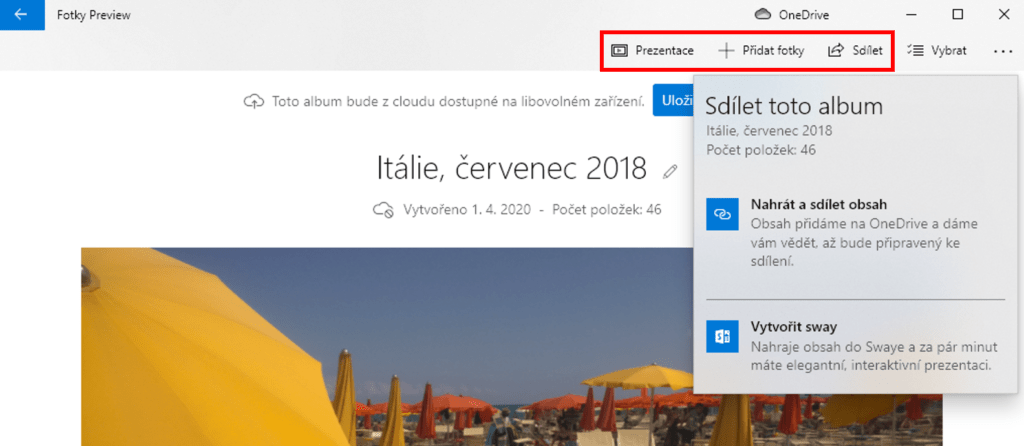 Jak můžete vidět na obrázku, do automaticky vytvořeného alba samozřejmě můžete přidávat vlastnoručně další fotky. Všimněte si i tlačítek Prezentace, díky kterému si lze nechat fotky přehrát, a Vytvořit sway, díky němuž zase můžete nechat si automaticky vytvořit webovou prezentaci. Že Sway ještě neznáte? Podívejte se na článek Interaktivní a webové prezentace v Microsoft Sway.
