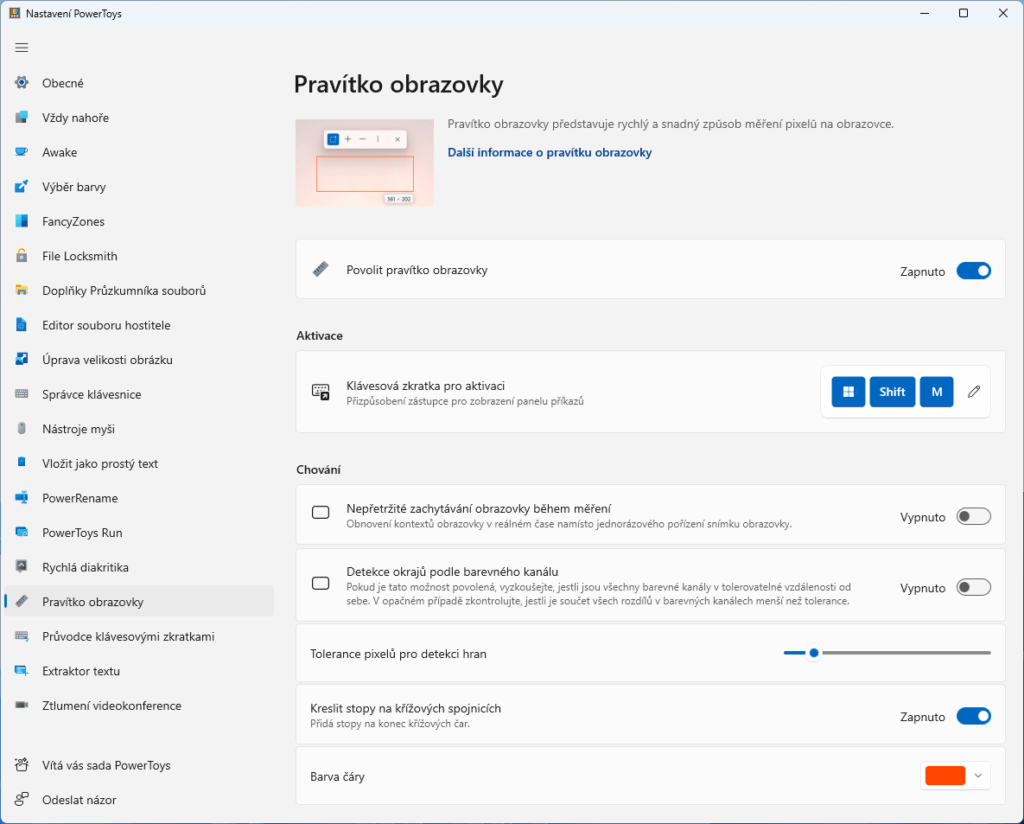 V základním nastavení pravítko vyvoláte klávesovou zkratkou Win + Shift + M. Dále lze nastavit, aby se pohyblivé prvky přestali hýbat po dobu měření, aby jste dostali přesný výsledek v daný okamžik, nebo aby se obrazovka hýbala dál a vy znali všechny vzdálenosti, které mezi nimi mohou existovat. A pokud by se vám stalo, že měřící čáry nevidíte kvůli barevné shodě, tak i tu na pár kliknutí přenastavit.