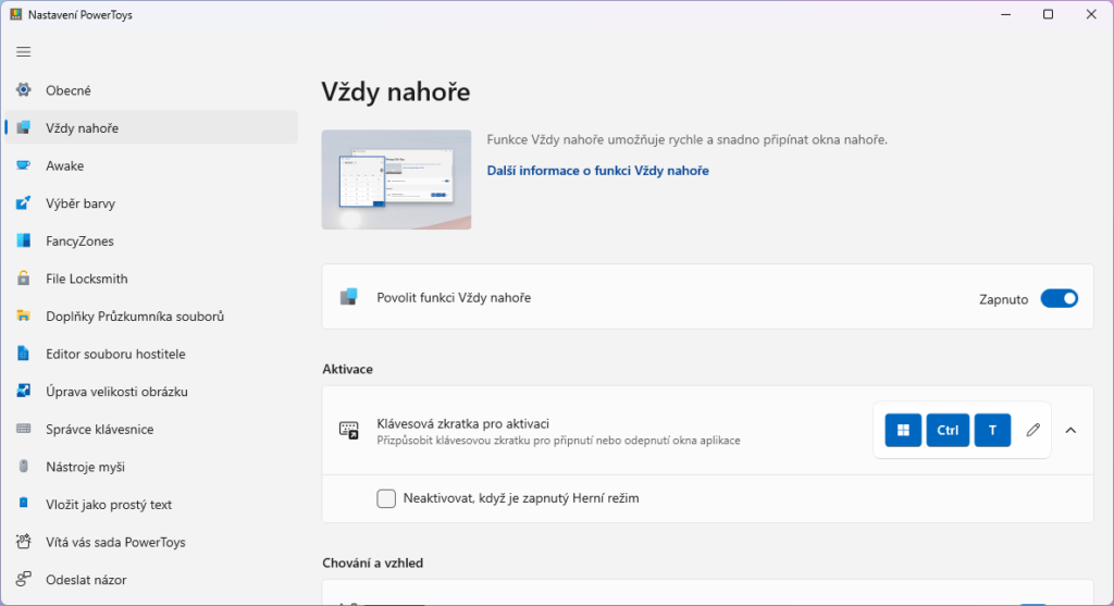 Jistě se vám už někdy stalo, že jste otevřeli spoustu aplikací a to okno, se kterým pracujete jste nemohli najít. Díky PowerToys a funkci Vždy nahoře se tohoto problému nikdy víc nemusíte děsit. po zapnutí funkce klávesovou zkratkou Win + Ctrl + T nastavíte zvolené okno tak, aby při manipulaci s okny za ním zůstalo okno stále v popředí. Klávesovou zkratku lze, stejně jako pro všechny PowerToys funkce, změnit v aplikaci.