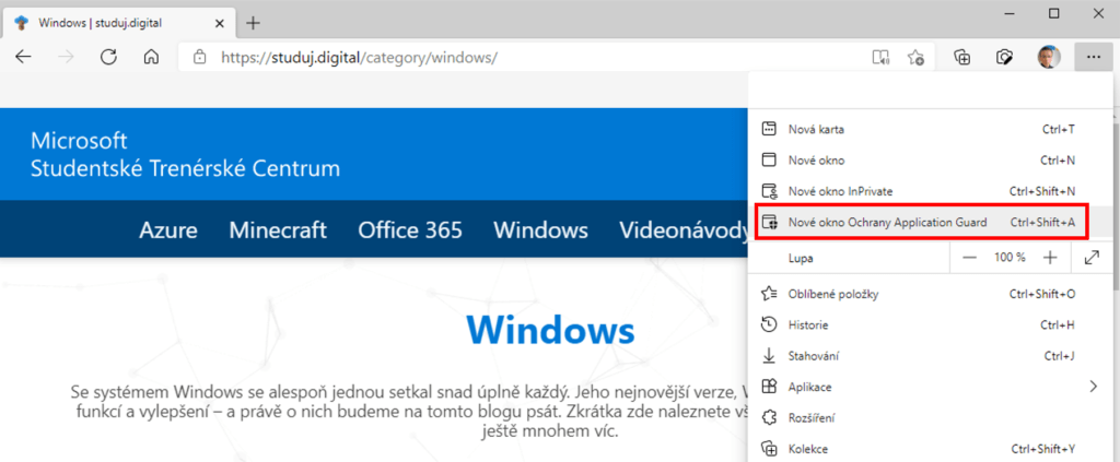 Výběr instalace a aktivace MDAG je na vás, dále jen stačí při spuštění webového prohlížeče Microsoft Edge otevřít tzv. Nové okno Ochrany Application Guard. K této možnosti se dostanete kliknutím na nabídku tří teček v pravém horním rohu okna.
