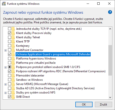 - Zaškrtněte políčko u Ochrana Application Guard v programu Microsoft Defender a potom klikněte na OK.