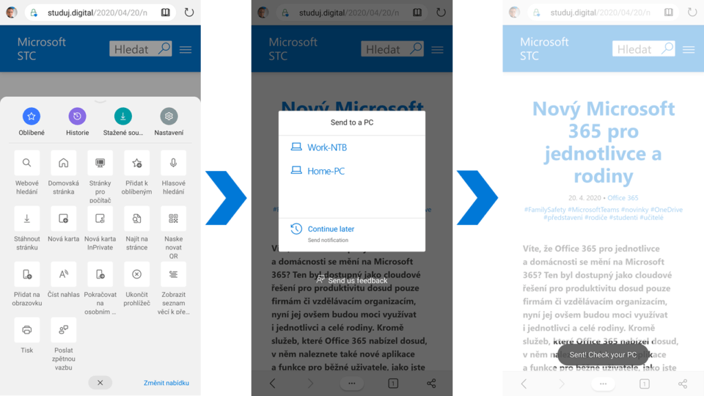 Narazili jste na telefonu při procházení webu na zajímavou stránku, se kterou byste chtěli pracovat dále a na počítači? Nyní již nemusíte znovu stránku hledat nebo si e-mailem posílat její odkaz. Microsoft Edge si lze nainstalovat i do vašeho mobilního zařízení z Google Play nebo App Store, díky čemuž získáte perfektní integraci s vaším Edge na počítači. Ujistěte se, že jste přihlášení na obou zařízeních přes váš osobní Účet Microsoft, a pak na telefonu vyzkoušejte funkci Pokračovat na osobním počítači, kterou najdete v dolním rozbalovacím panelu. Vyberte požadované zařízení a ihned se na něm stránka otevře.