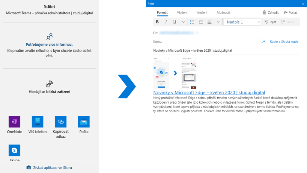 Sdílení informací s ostatními – běžná součást dnešního světa, díky které se neustále posouváme dál. Microsoft Edge přináší propracovanou nabídku možností sdílení, jež dokáže automaticky načítat kontakty z aplikace Lidé a ihned jim poslat odkaz právě otevřeného webu e-mailem. Zcela jistě oceníte možnost sdílení pomocí bezdrátových technologií, jako je Bluetooth. Dokonalá je integrace i dalších aplikací instalovaných ve Windows, takže si jednoduše uložíte webovou stránku do OneNote nebo ji zašlete někomu pomocí Skype. Všechny tyto a další možnosti najdeme v nabídce Nastavení pod možností Sdílet.