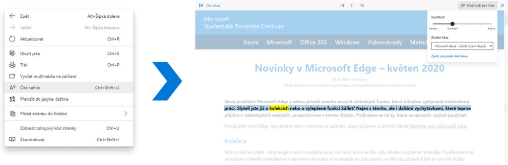 Integrovaná čtečka výrazně usnadňuje procházení webu všem uživatelům, nejvíce pak asi handicapovaným osobám. Tato funkce dokáže přečíst jakýkoli webový obsah, ať už jsou to zprávy, článek z blogu či recept. Potěšující zprávou je, že funkce je již nyní dostupná i pro češtinu. Začneme tím, že označíme text, který chceme nechat si přečíst, a klikneme na něj pravým tlačítkem. Pokud chceme, aby nám čtečka přečetla celou webovou stránku, jednoduše klikneme pravým tlačítkem kamkoli do volného prostoru. V nabídce vybereme možnost Číst nahlas a je to. Právě čtený text se označuje a rychlost čtení si lze kdykoli upravit.