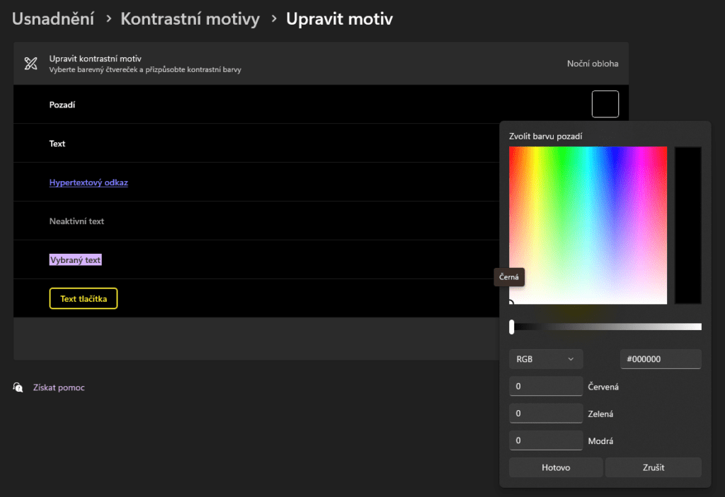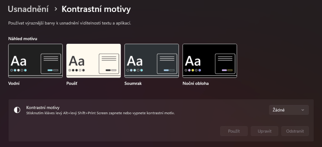 Může se stát, že Vám žádný z vytvořených motivů nebude vyhovovat. Pro tento případ existuje možnost vytvořit si svůj vlastní. Pro osoby trpící jednou z forem barvosleposti může být tato funkce velkou výpomocí. K úpravě stiskněte v nabídce Kontrastní motivy tlačítko Upravit.
