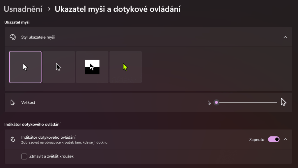 Stačí jen zvolit tlačítko Start, pak vybrat Nastavení > Přístupnost > Ukazatel myši & dotykového ovládání a zvolit možnost, která Vám nejvíce vyhovuje.