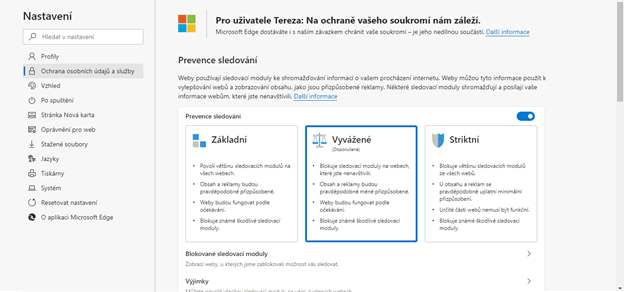 V nastavení se navíc změnil i panel "Ochrana osobních údajů a služby", kde si můžete vybrat ze třech možností "Prevence sledování". Můžete mít základní, vyváženou nebo striktní, přičemž vyvážená prevence je doporučená. A co to znamená? Pomocí tohoto si můžete nastavit úroveň, jakou vás Edge chrání před online světem, reklamami, škodlivým softwarem a podobně.