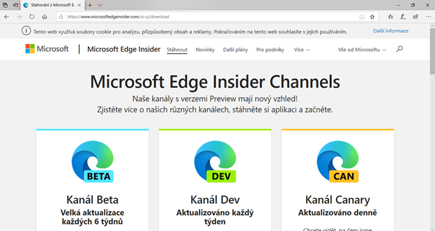 A stejně jako existuje program Windows Insider, můžete se zapojit i do aktivního testování nových verzí prohlížeče Edge, a mít tak přístup k novým funkcím ještě dříve než všichni ostatní. Stránka Microsoft Edge Insider nabízí celkem tři možnosti, všechny můžete využívat současně a mít nainstalované paralelně na svém počítači. První možností je kanál Beta, který je aktualizován každých šest týdnů, díky čemuž se stihnou vychytat všechny chyby. Kanál Beta je tak nejstabilnější. Další možností je kanál Dev, který je aktualizován jednou týdně. Kanál Dev je “zlatým středem” mezi kanálem Beta a posledním kanálem, kanálem Canary. Ten je aktualizován denně, díky čemuž máte téměř okamžitý přístup ke všem novinkám, které vývojáři implementovali předchozí den. Všechny kanály si můžete pořídit jak pro mnohé verze Windows, včetně Windows Server, tak i pro macOS.