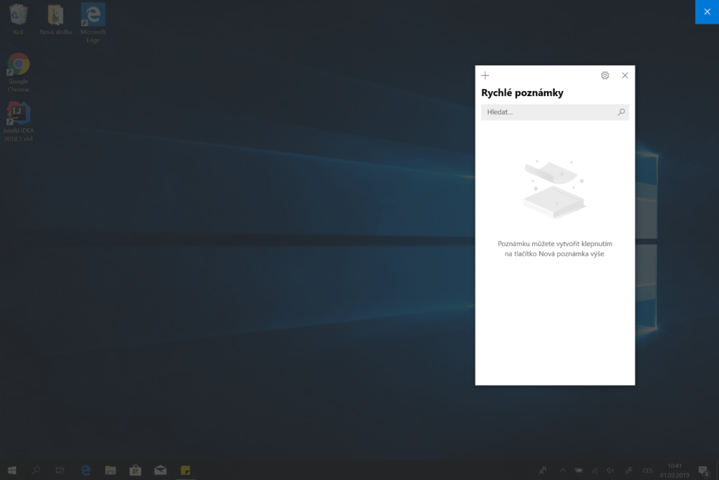 Vytvoření poznámek je poměrně intuitivní, stačí stisknout tlačítko + (plus) a vytvoří se nová poznámka. Poznámek mohou být dva typy – psaný na klávesnici a psaný ručně, tedy pomocí funkce Windows Ink. Takto potom může vypadat vaše pracovní plocha: