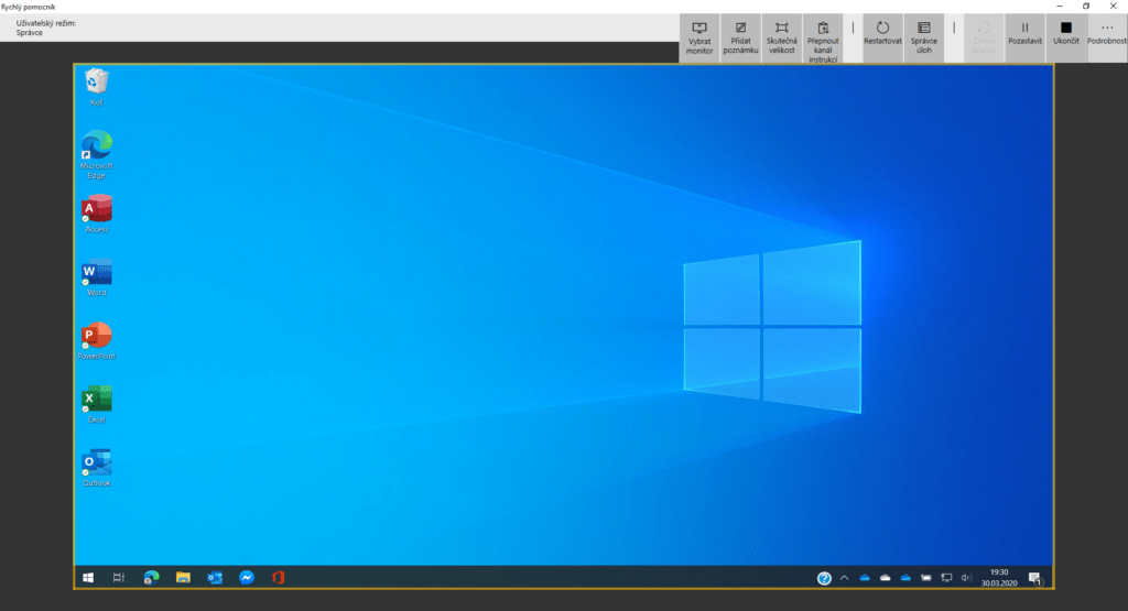 Po úspěšném připojení, výběru sdílení a potvrzení druhé strany se asistentovi zobrazí okno s obrazovkou vzdáleného počítače a může se pustit do pomoci. Obě strany spolu mohou komunikovat přes kanál instrukcí, pomocí kterého lze posílat veškeré textové pokyny a jiné zprávy. Ten naleznete v horní liště jako čtvrté tlačítko zleva. Pomáhat můžete i graficky, přes nástroj Přidat poznámku, který se nachází opět v horní liště, můžete na vzdálenou obrazovku kreslit, například označovat, kam má člověk na druhé straně kliknout nebo v čem byl zakopaný pes. Mimo tyto komunikační funkce lze v režimu úplného řízení vzdálené zařízení restartovat nebo na něm spustit Správce úloh, což určitě při pomoci využijete, vše opět z horní lišty.